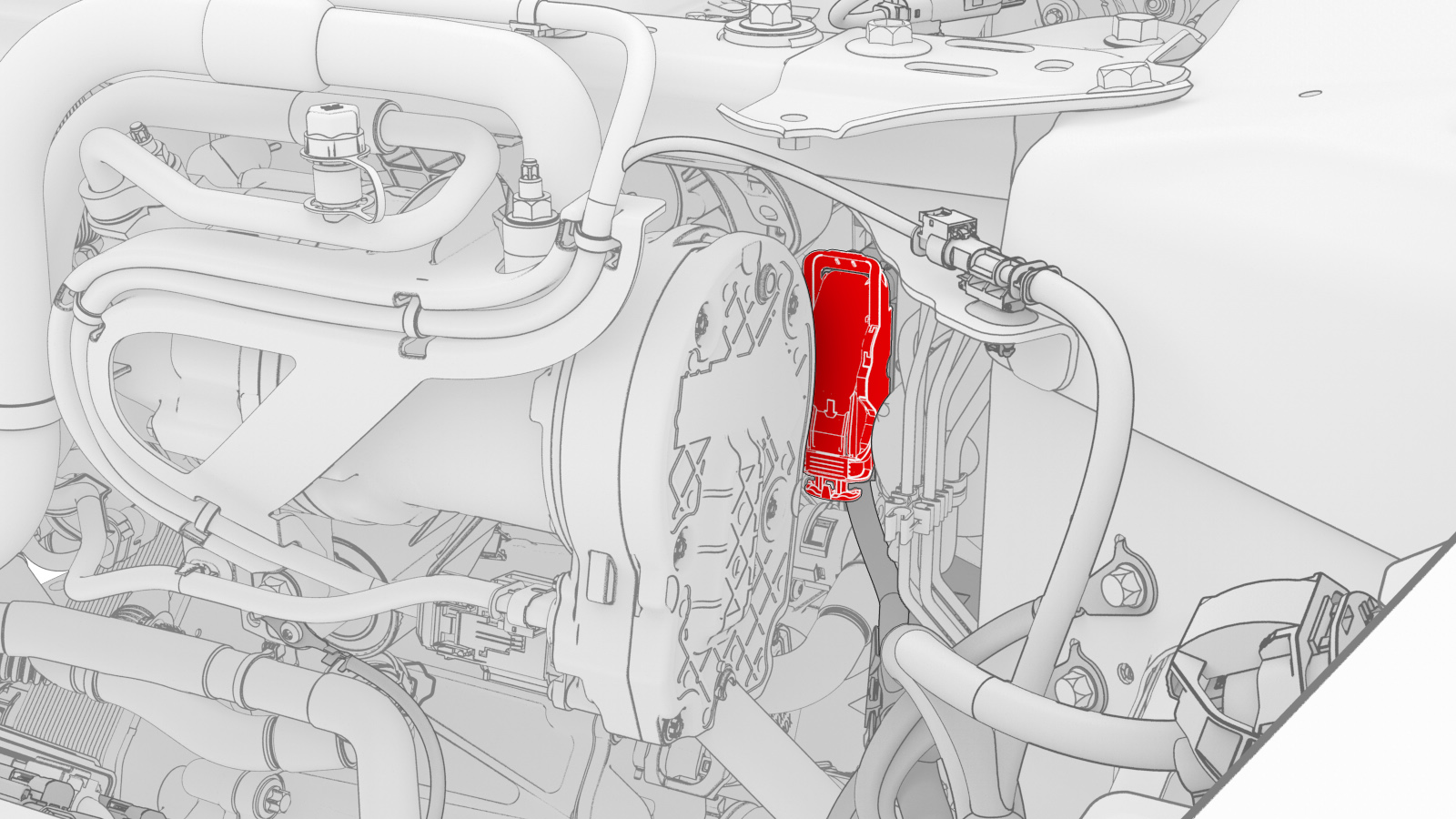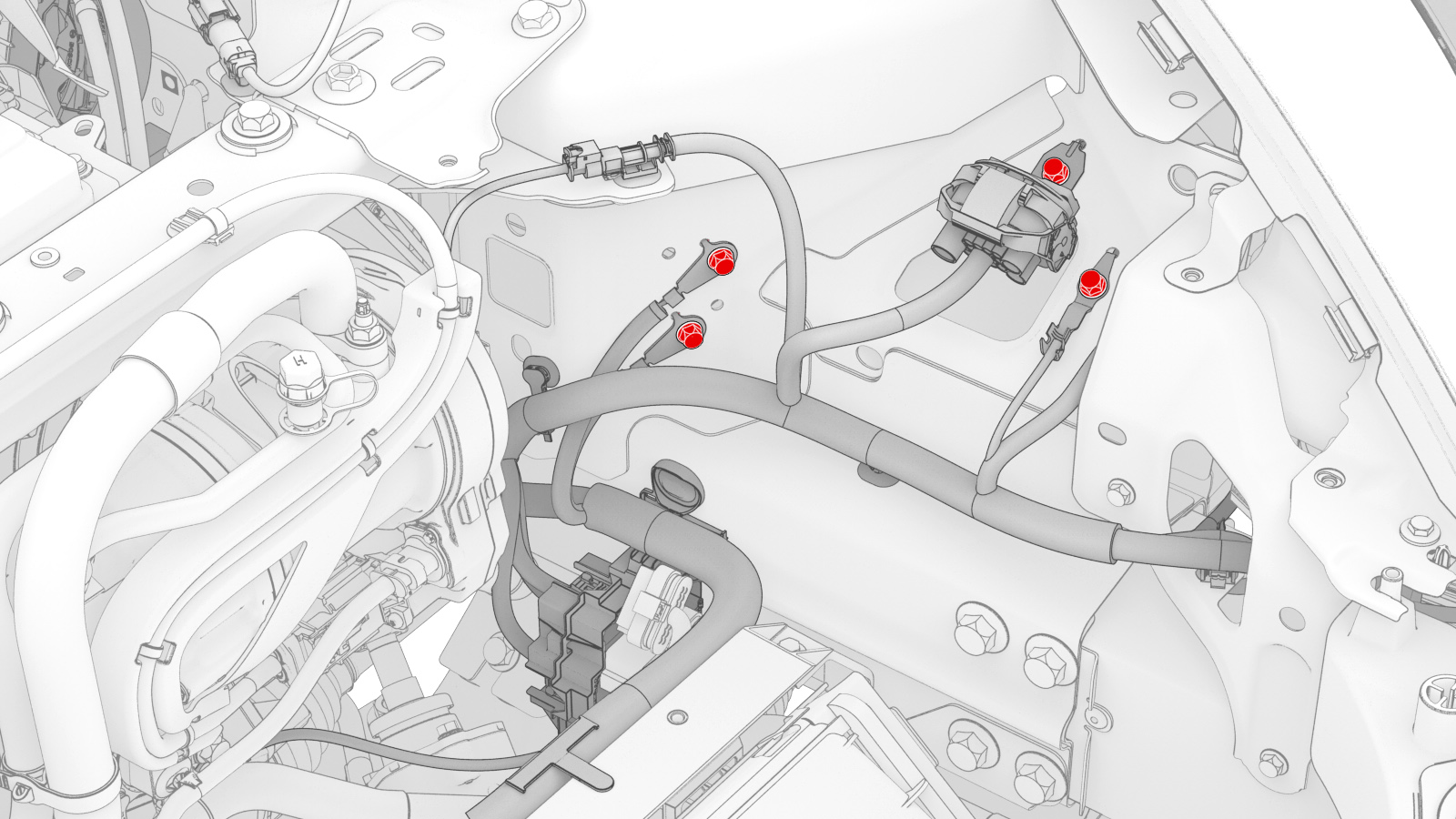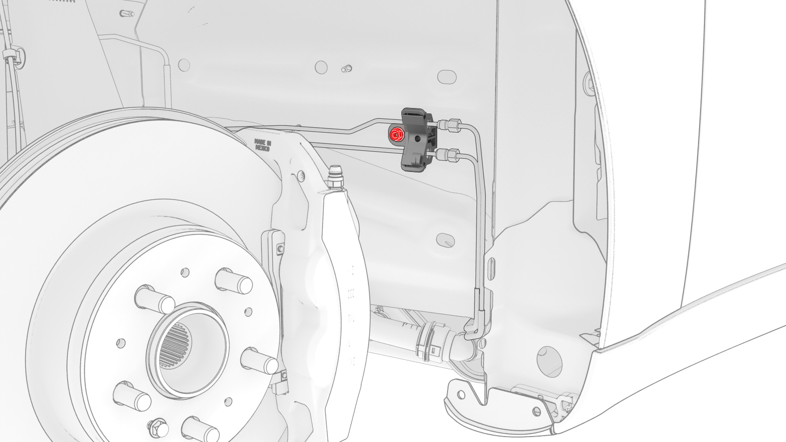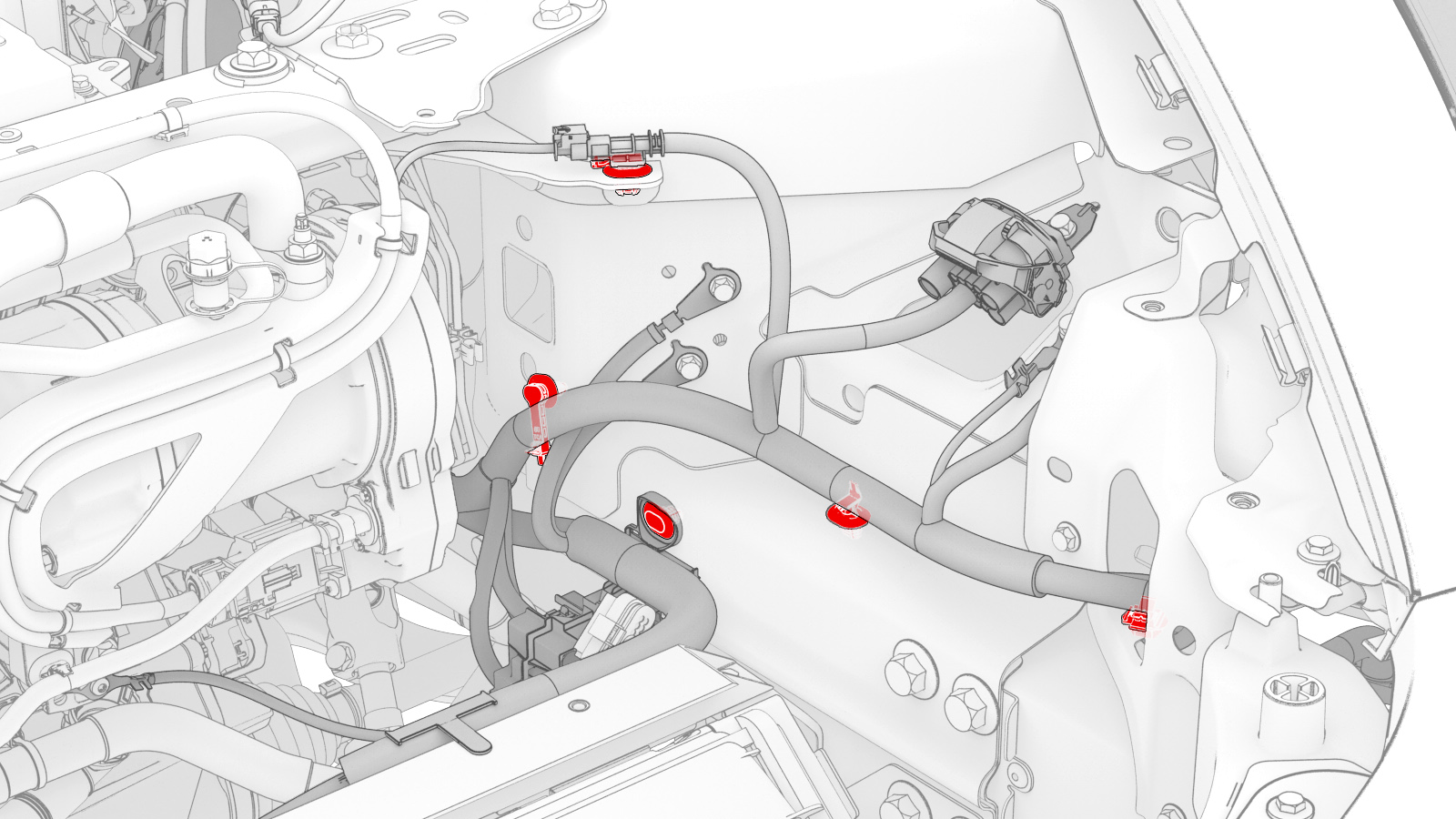 注将管路穿过 LH 轮罩移入,然后移到 RH 侧,然后向后移动。