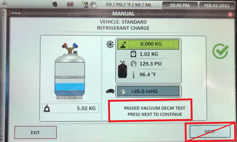 - 在空调机上,确认排放压力不超过 26 巴,吸入压力不低于 1.15 巴,然后点击NEXT。