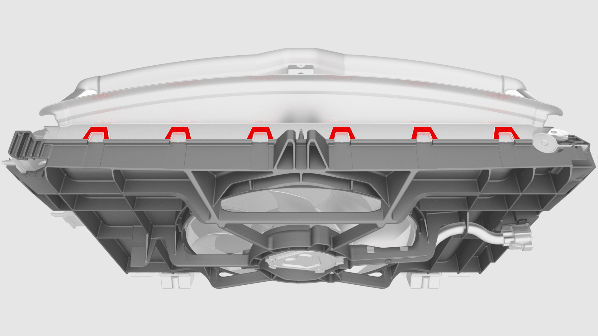 - 将主动进气格栅放置在冷却风扇模块上,然后安装将主动进气格栅固定到冷凝器风扇模块底部的下部卡子。