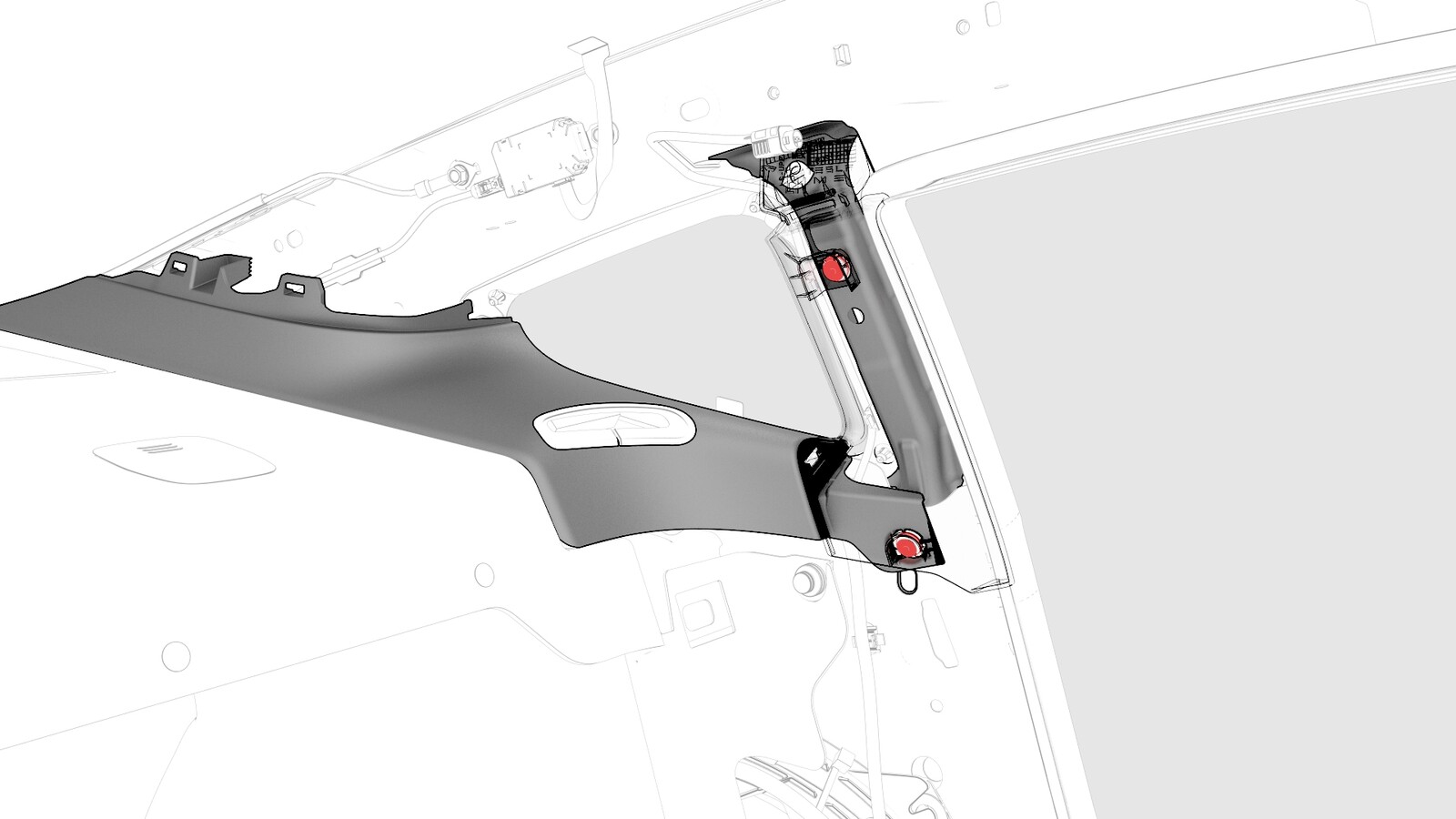 - 将左侧 C 柱上饰板滑入侧面帘式气囊下方,以安装饰板,然后对齐上部卡子。使用卡子(2 个)固定饰板。
