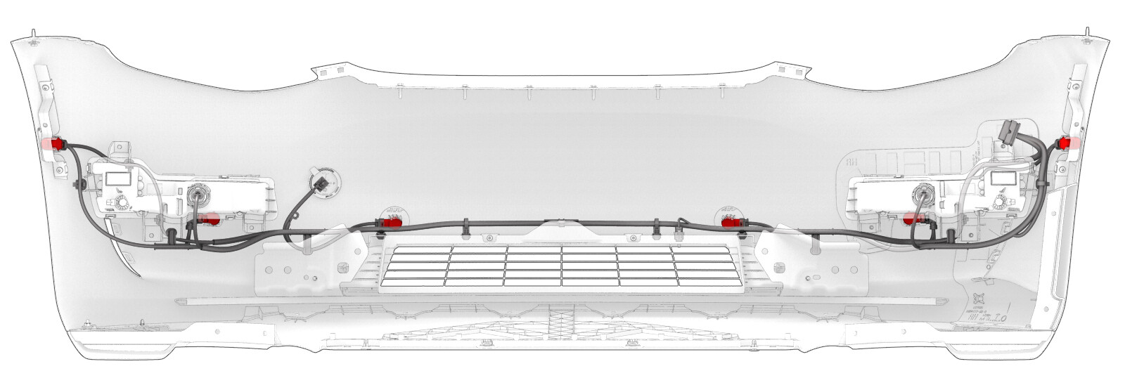 - 安装将前饰板线束固定到 RH 和 LH 前转向灯/雾灯的夹子。