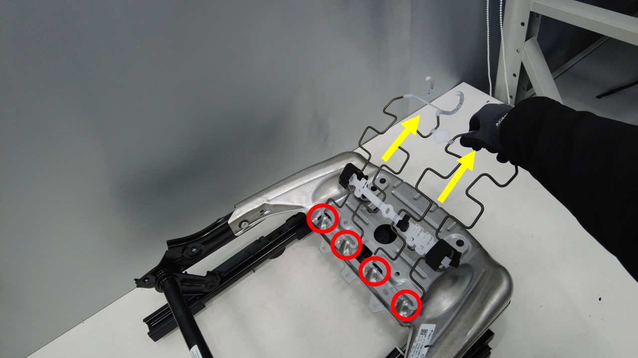 安装新的螺栓(4 个),将驾驶位座椅靠背框架左右侧固定到座垫框架上。