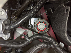 注4 个螺栓,10 毫米,5 Nm;松开 4 个盖子以便操作螺栓;新款车上的紧固件数量可能会有所不同