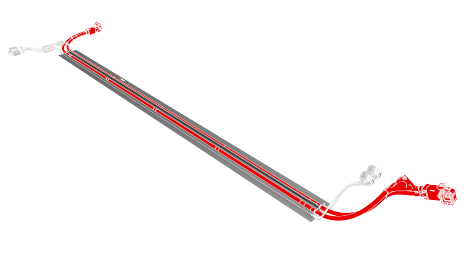 将高压电池至前驱动单元线束安装到高压电池中梁滑板中间。