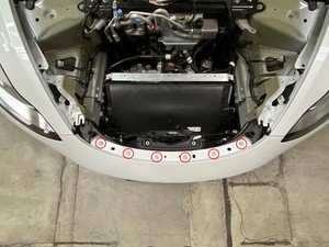 注12x clips. Make sure frunk assembly is fully seated onto clips. Number of clips may vary on older vehicles. Ensure A/C compressor HVIL harness is not pinched between frunk assembly and thermal beam.