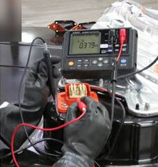 在直流输入接头和最近的高压电池仓盖板焊缝螺母螺纹之间执行 Hioki 电阻测试。