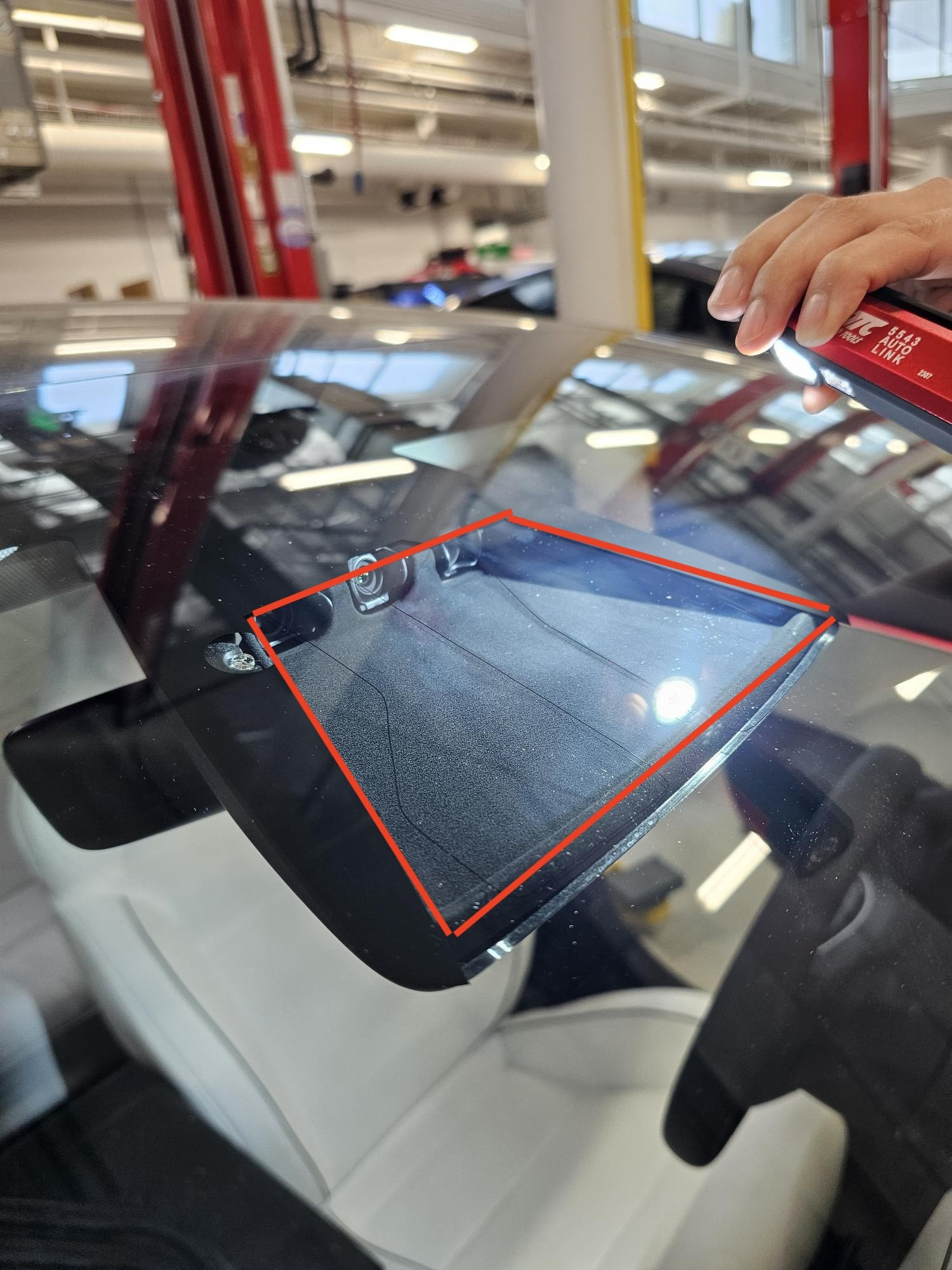 注请彻底清洁整个区域,包括所有边角。注对于 HW4 车辆,需特别注意确保凹槽干净(请参阅图片确认凹槽位置)。注清洁时,请使用摄像头预览功能确保毛巾直抵所有空腔,且摄像头正前方的玻璃清洁得当。 -