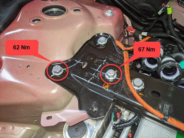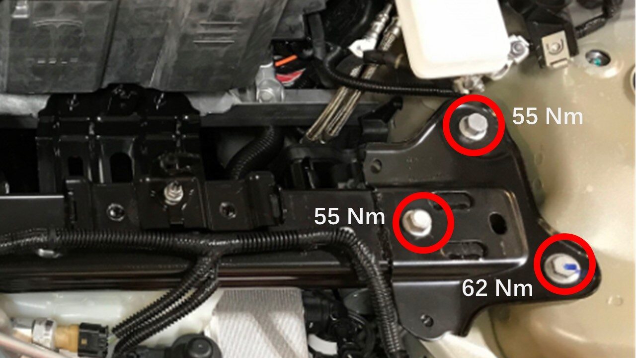 注1x bolt, 15mm, 67 Nm, 1x bolt, 15mm, 62 Nm, See image for torque location
