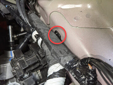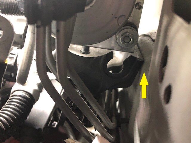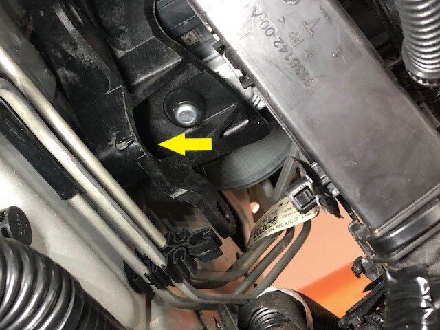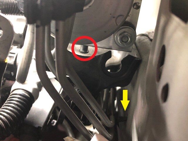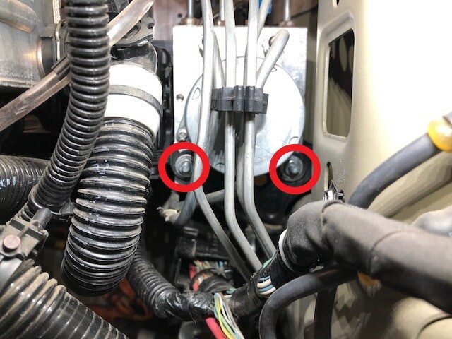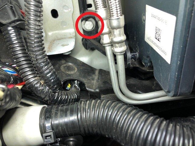 Remove upper bolt securing the hydraulic control unit bracket to frame rail