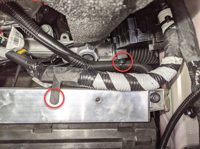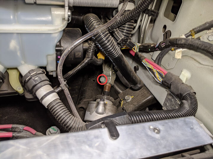 Remove bolt securing 12V battery upper tie down strap to AC compressor bracket