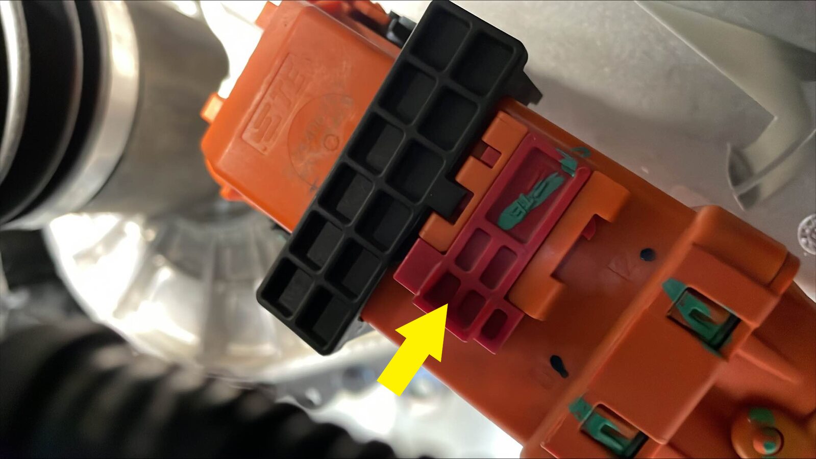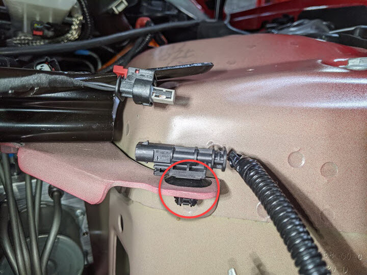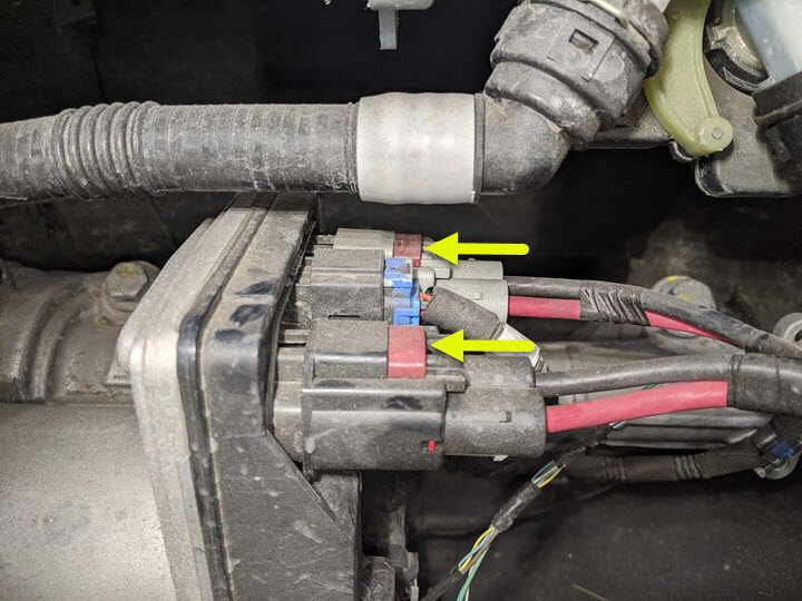注2x connectors, Do not push down on red tab, Pull red tab to disengage lock, Pull again to release connector, Image zoomed out for location reference