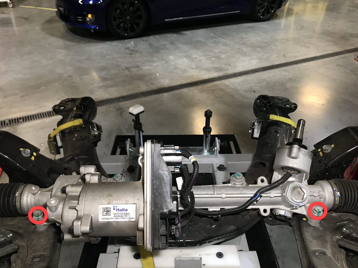 - Remove the outer bolts that attach the steering gear assembly to the front subframe.