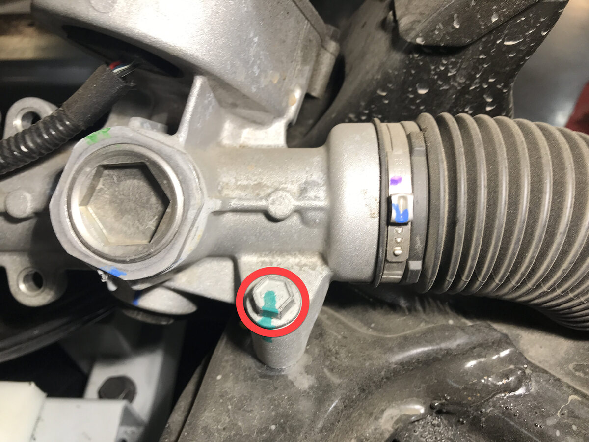 - Remove the inner bolts that attach the steering gear assembly to the front subframe.