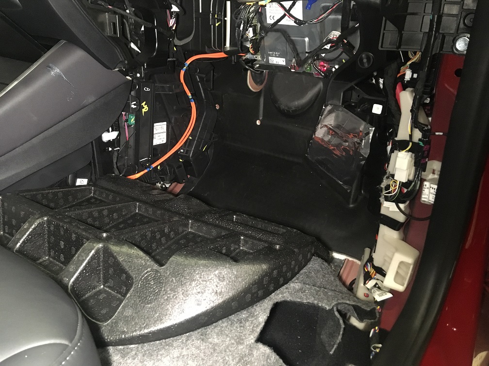 - 从右前主地毯的 2 个卡子上松开电气线束,然后将地毯向回折起。