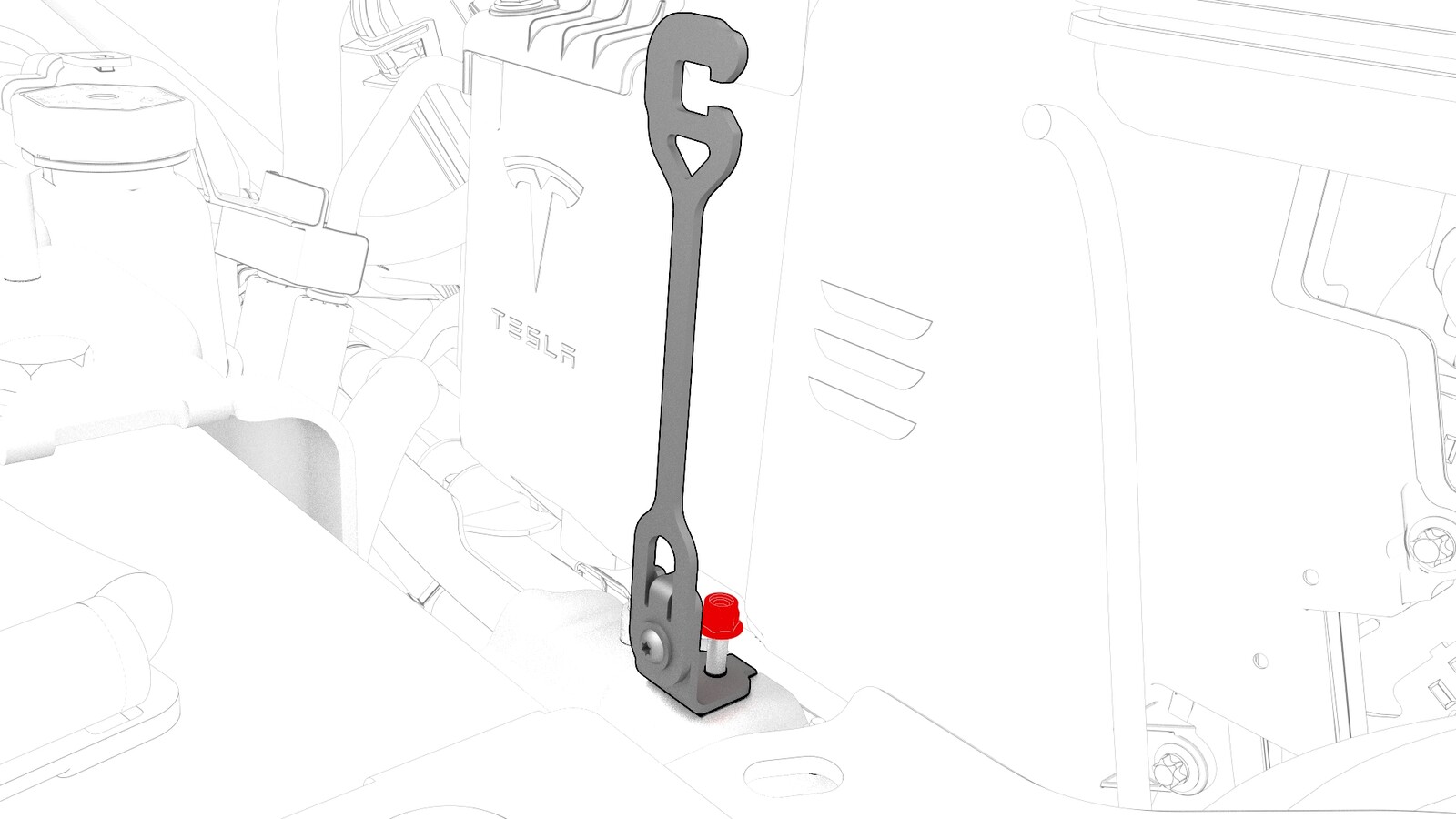 将前部挂钩安装到电池支架上,然后安装新螺母,将前部挂钩固定到电池支架上。