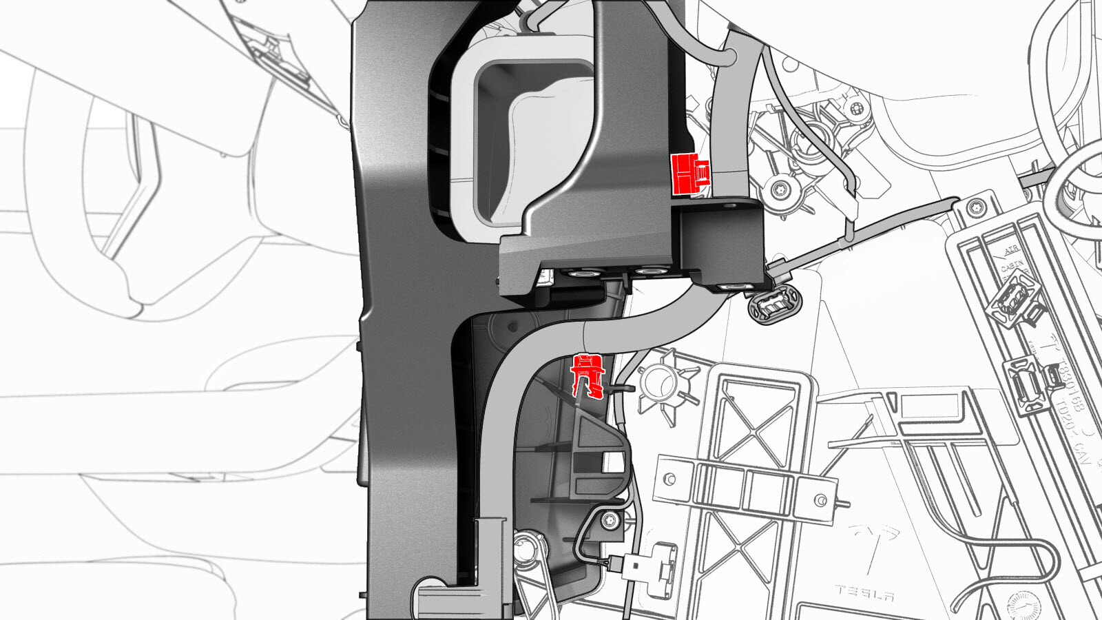 - 松开将仪表板线束固定到供暖、通风和空调总成 RH 的夹子。