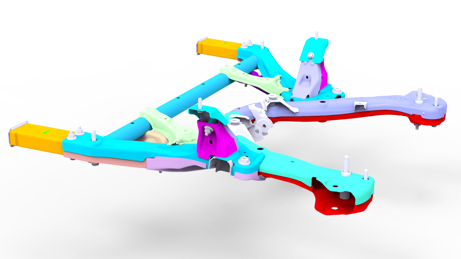 - 在助手的帮助下,从副框架举升工具上解锁前副框架,然后从副框架举升工具上拆下前副框架。