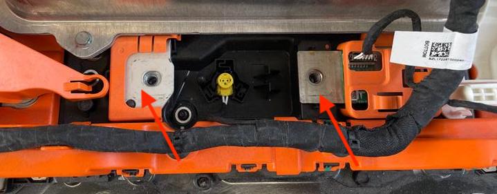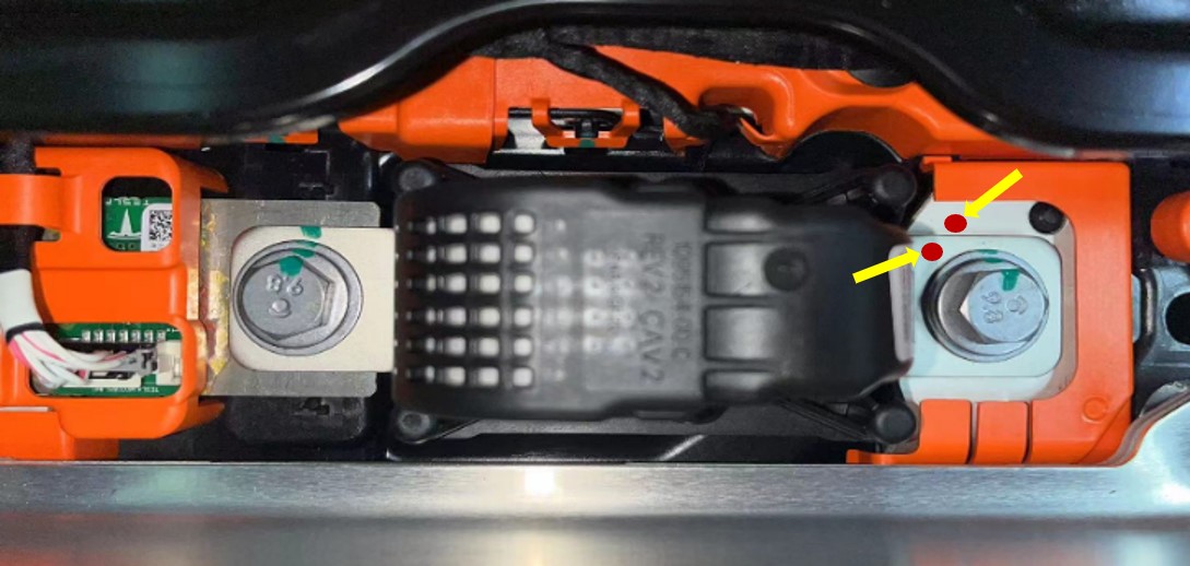安装新的螺栓,将烟火电池断接开关固定到高压电池,紧固后,使用油性记号笔标记这些螺栓。