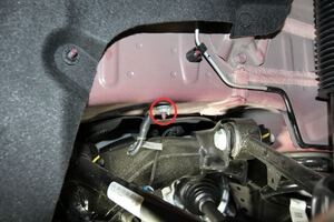 - 安装并手动拧紧新的后副车架左侧螺栓,将后副车架固定到车身。