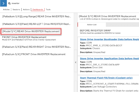 - 在 Toolbox 3 中,点击Dashboards选项卡,在搜索字段中输入 “Rear Drive Inverter Replacement”,然后点击[Model 3/Y] REAR Drive INVERTER - Replacement。