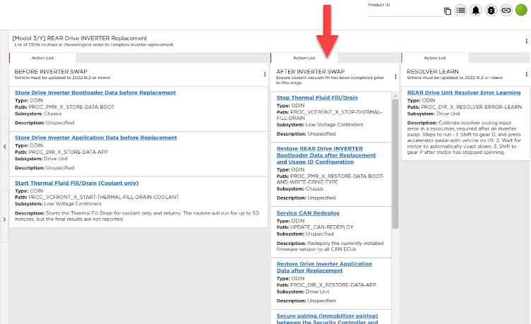 - 在 “AFTER INVERTER SWAP” 操作列表中,点击 Restore REAR Drive INVERTER Bootloader Data after Replacement and Usage ID Configuration,点击 Run,然后等待例行程序完成。