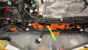 6 Nm (4.4 lbs-ft) - 检查后副车架电气线束逻辑连接器和后驱动单元变流器逻辑连接器上是否有冷却液,然后使用车间用压缩空气和清洁干燥的车间毛巾清除这些连接器上的任何冷却液。