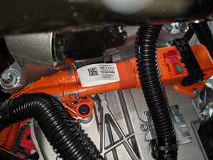 - 滑动红色锁片,抬起黑色手柄,断开后驱动单元高压线束与后驱动单元变流器高压接头的连接,然后将高压线束置于一旁。