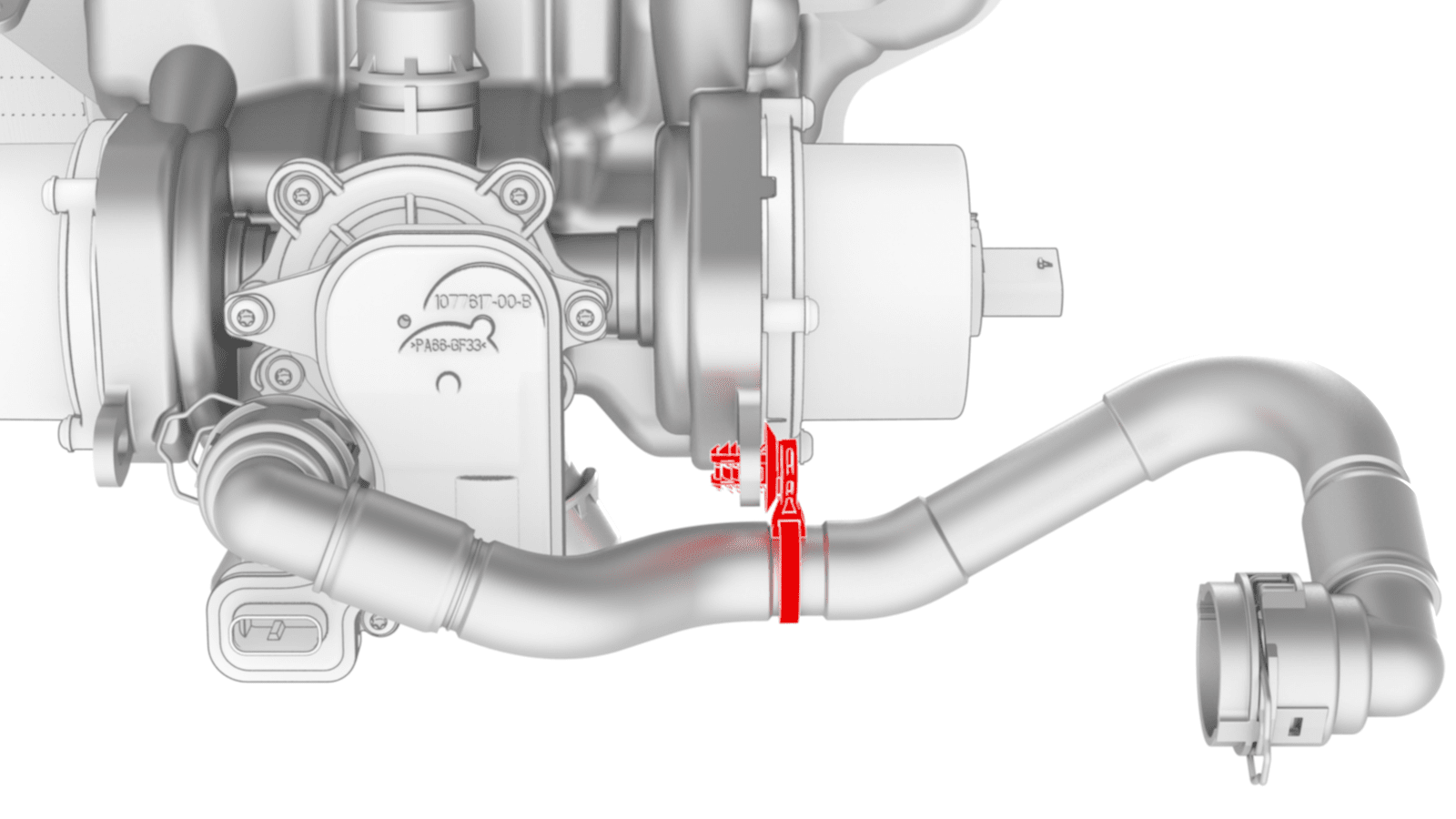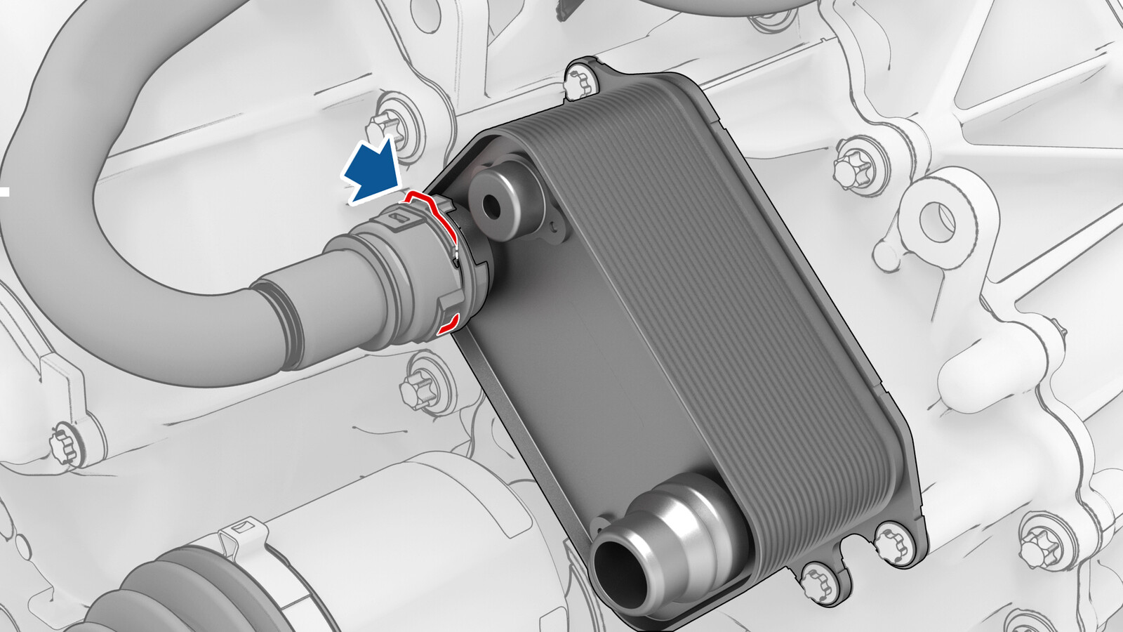- 松开将热交换器至超级瓶冷却液软管固定到超级瓶的卡子,将冷却液软管移至一旁。