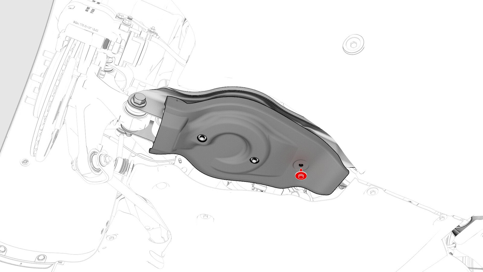 将左后悬架护罩安装到下尾连杆上,然后安装将悬架护罩固定到连杆的螺栓。