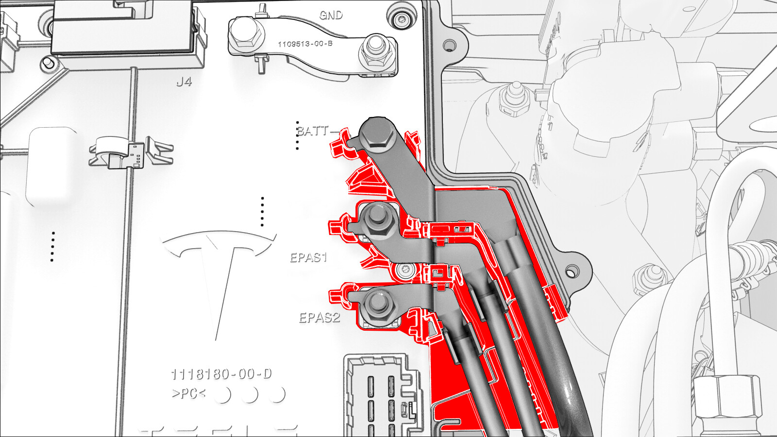 目视检查接地电缆在前车身控制器模块的相应通道中是否整齐地露出来且彼此平行。