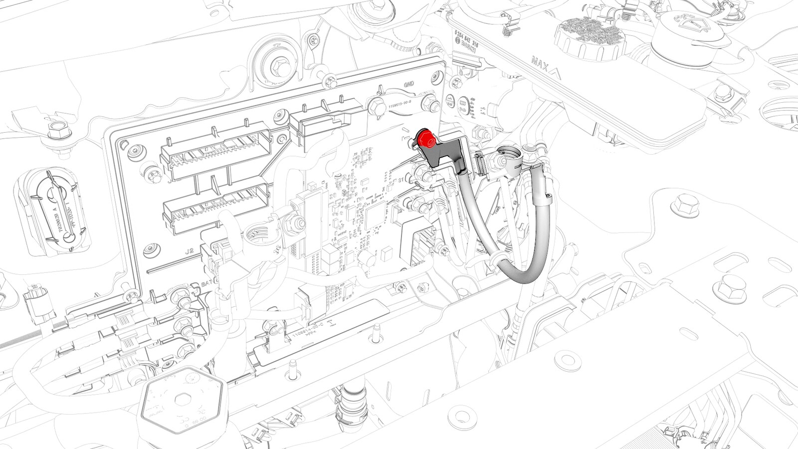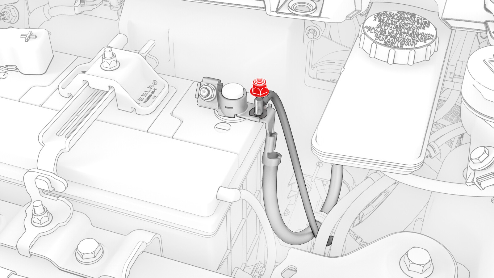 将电池接地电缆安装到前车身控制器模块上,然后安装新螺栓,将电缆固定到该模块。