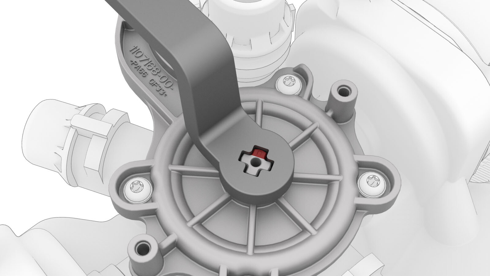 使用分流阀扳手将较大的杆外壳轴花键与五通阀执行机构上的较大凹口对齐,然后将五通阀执行机构置于五通阀盖上。