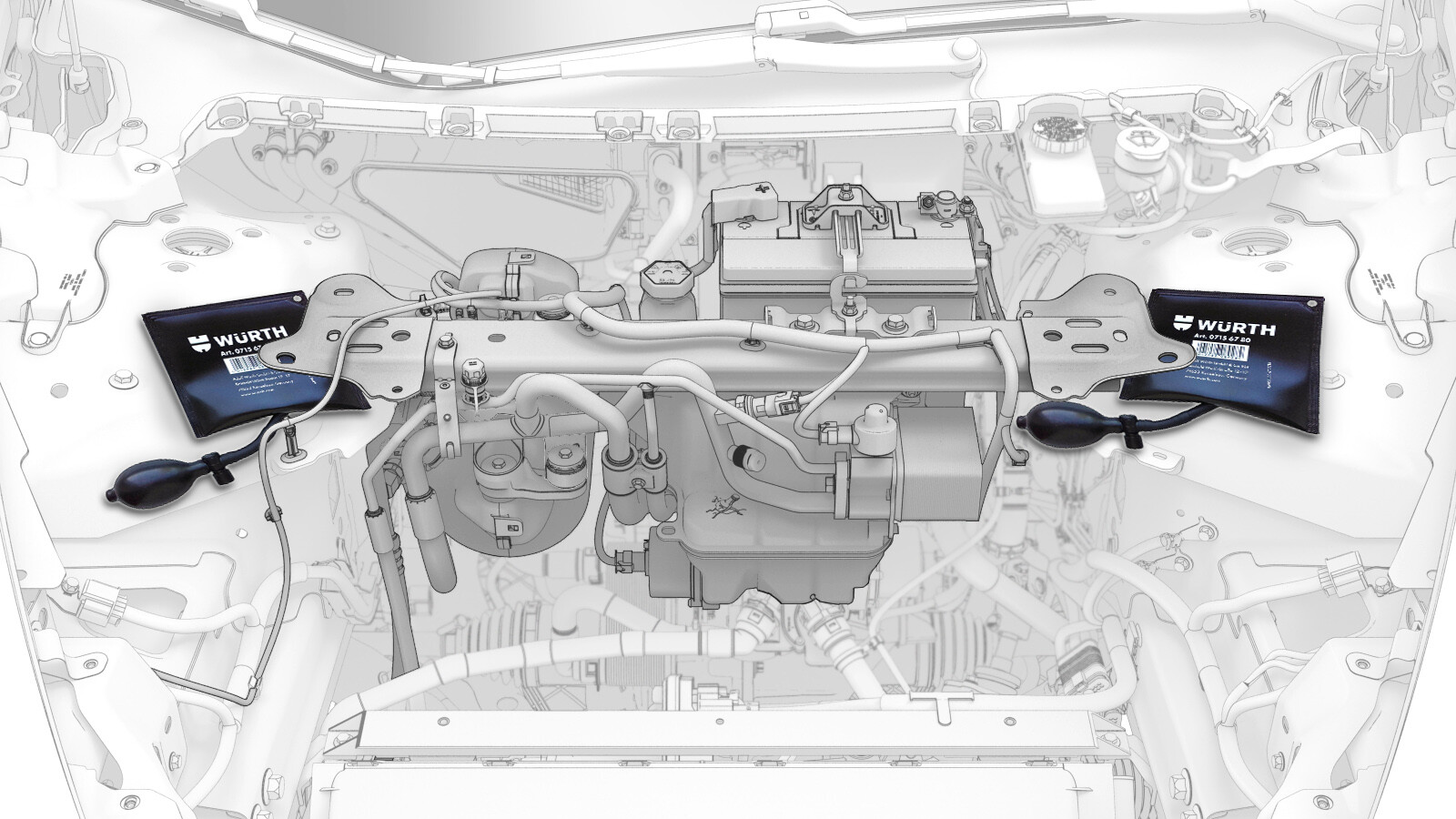 提示: 用平头螺丝刀提起减震塔支架,然后将充气气囊放在减震塔支架的两端。
