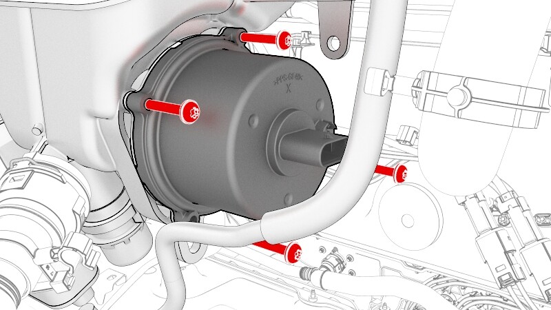 - 拆下并弃置将高压电池冷却液泵固定到超级瓶的螺栓,然后将冷却液泵从超级瓶上拆下。