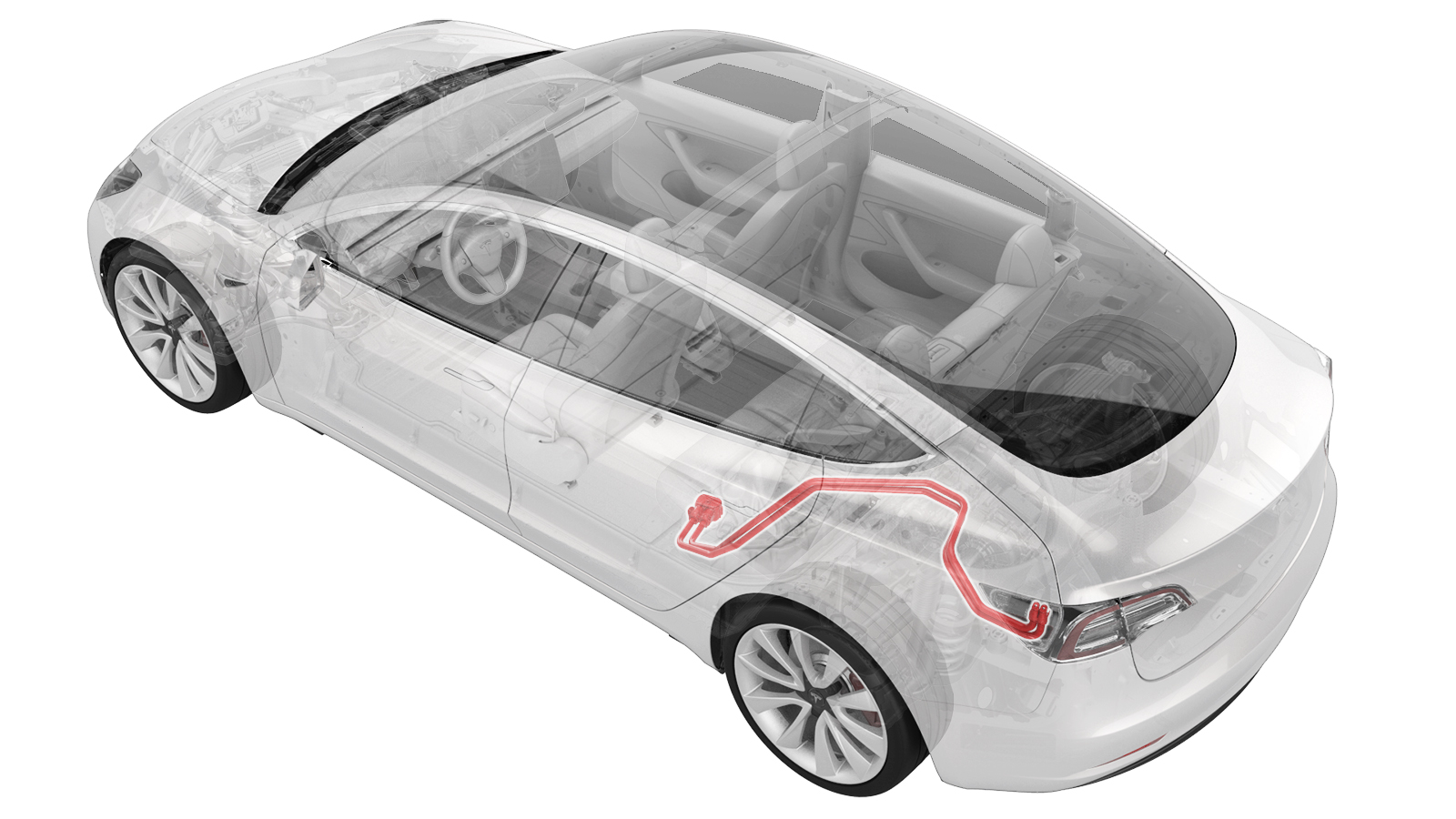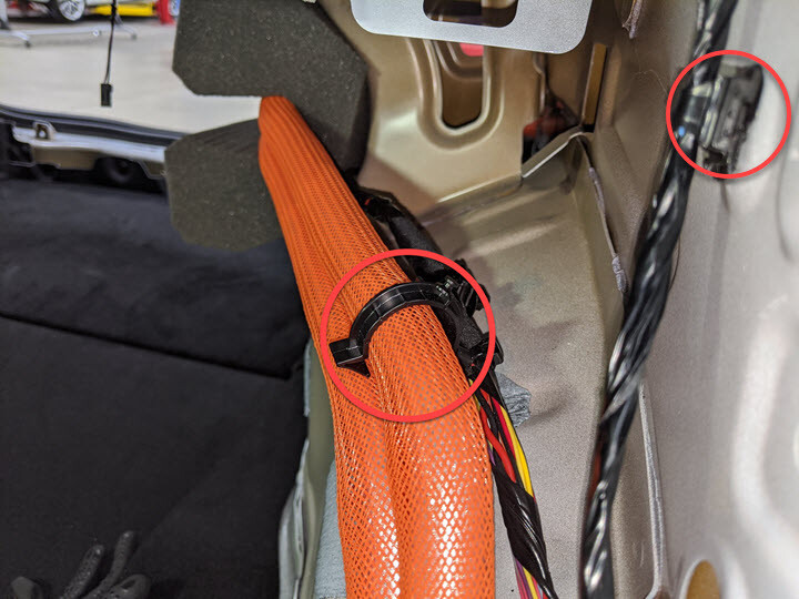 注将母排穿过后备箱,移动到车辆上。提示: 抬起母排后端,以便于安装。