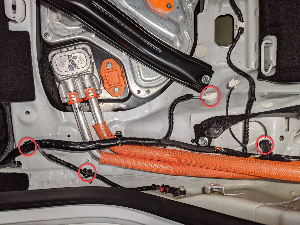 在协助下,将充电接口母排抬离高压接头,然后小心地操作母排穿过低压线束并从行李箱中穿出。