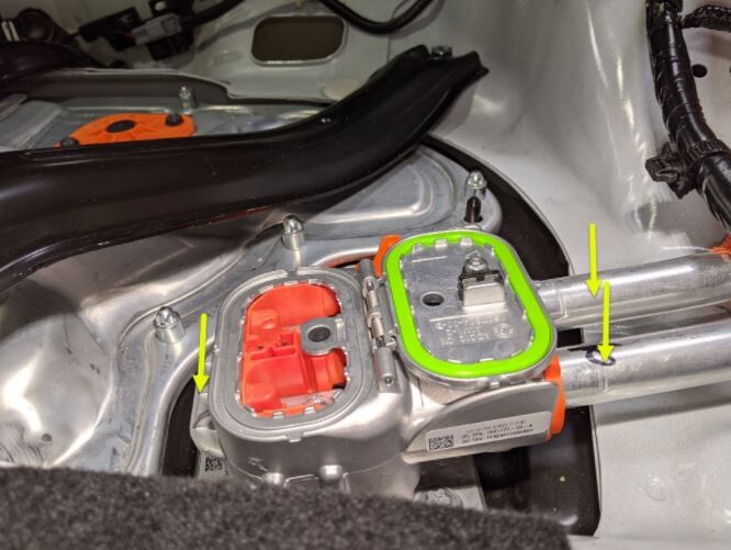 在高压电池仓处的各充电接口母排高压接头触点(2 个)上涂抹一滴导电膏。