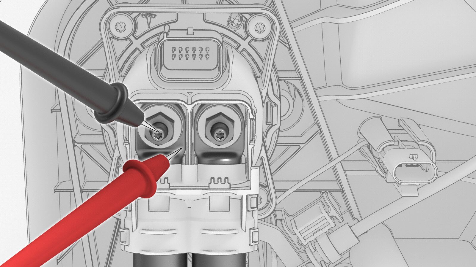 在充电接口处,使用 Hioki 电阻计测量充电接口母排引线与充电接口母排螺柱之间的电阻。另请对其他引线和螺柱执行该测试。