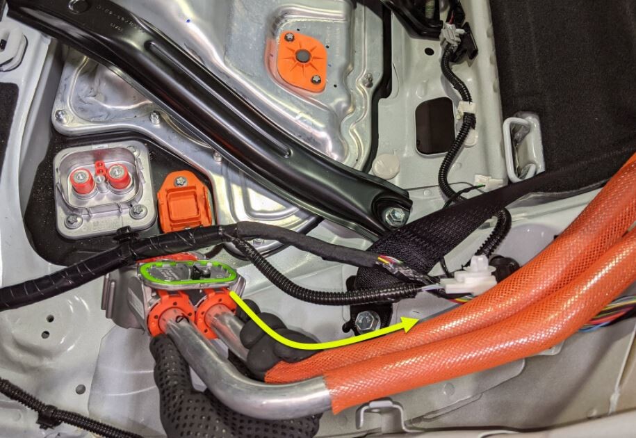 在高压电池仓处,使用 Hioki 电阻计测量充电接口母排引线与高压电池仓高压接头螺栓头之间的电阻。另请对其他引线和螺栓头执行该测试。