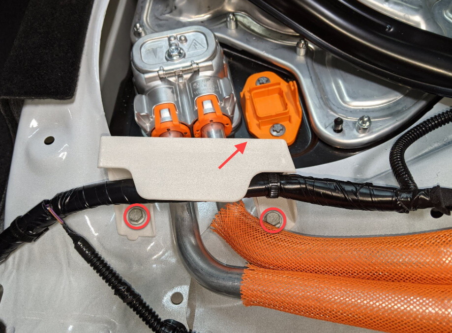 拆卸将充电接口母排固定到高压电池仓处高压接头的螺栓(2 个)。