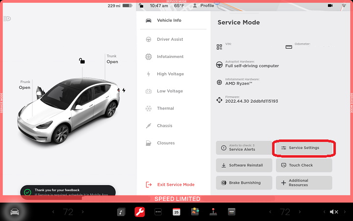 - 禁用触摸屏上的“限速”功能。点击Service > Service Settings > Remove Speed Limit。