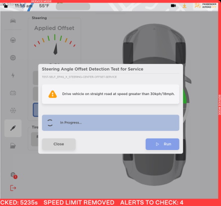点击Service > Chassis > Alignment and Tires > Offset Drive Test > Run,然后驾驶车辆以至少 18 英里每小时(30 公里每小时)的速度直行 500 米。