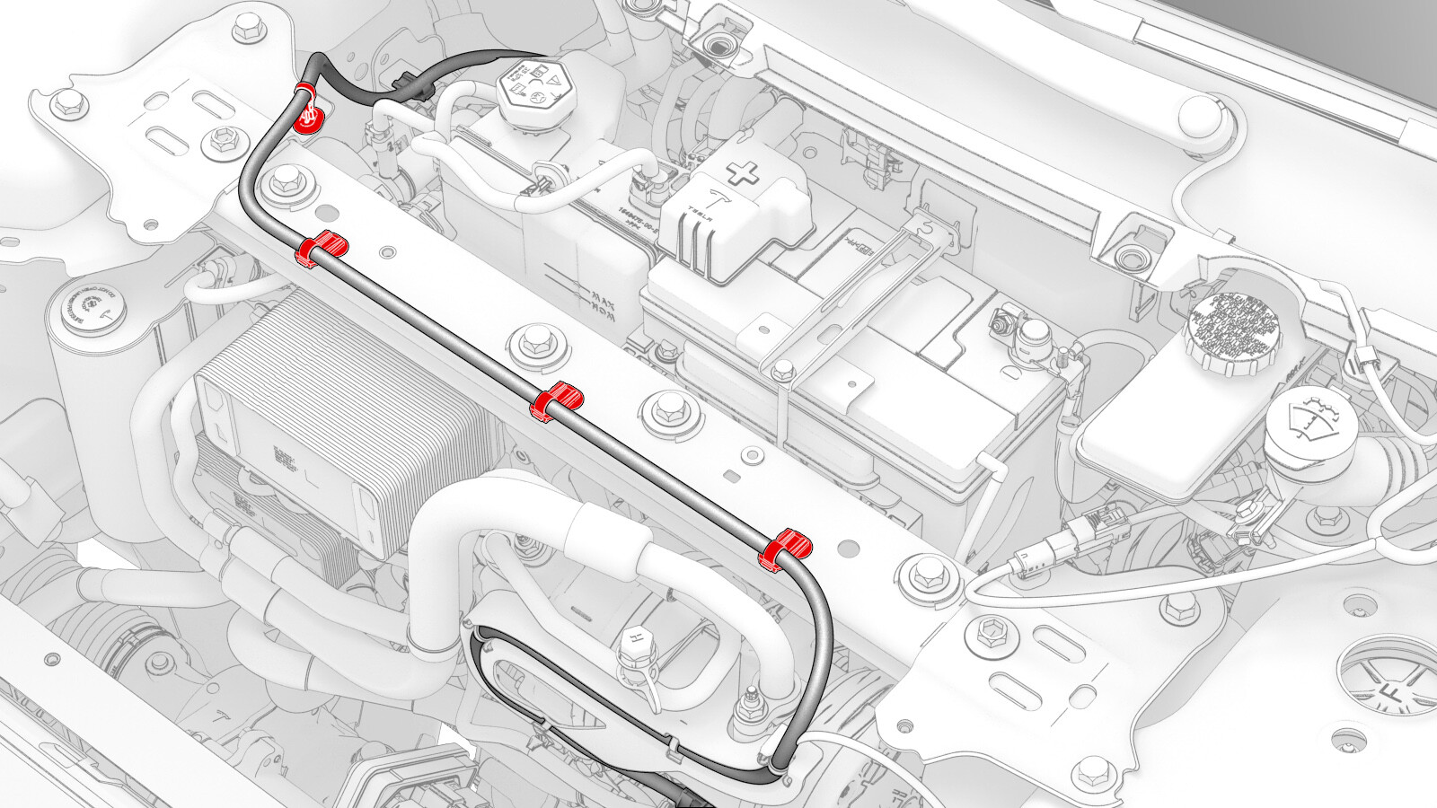 - 松开将冷却液软管固定到 12V 电池支架的夹子 (x2)。