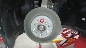 - 拆卸螺母(5 个)和垫圈(5 个),然后从左前轮毂上拆下液压轮毂拉拔器。