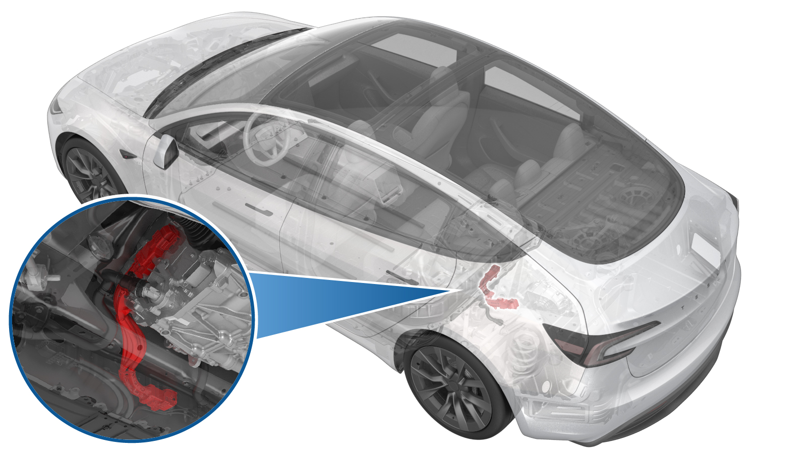 - 向上移动后驱动单元入口软管,将其移入高压电池与后副车架之间,然后向上移动,将其移入后驱动单元与后副车架之间。
