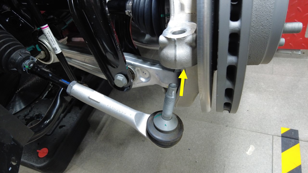 - 将左侧横向拉杆外总成放置到左前转向节上。
