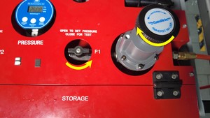- 缓缓打开压力测试固定装置上的 P2 阀,等待至少 5 分钟,使冷却液彻底排放干净。