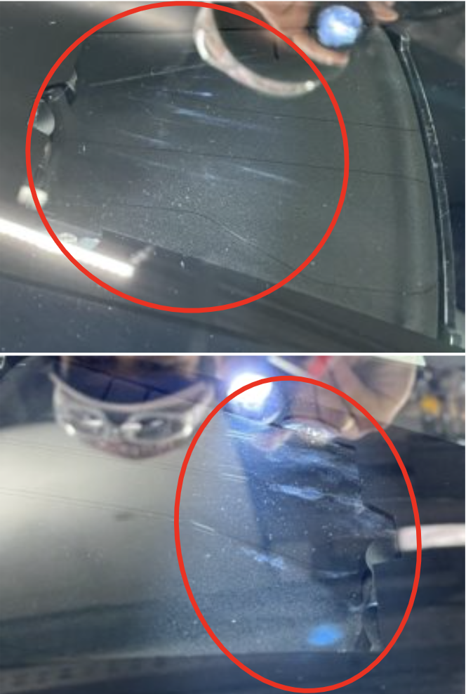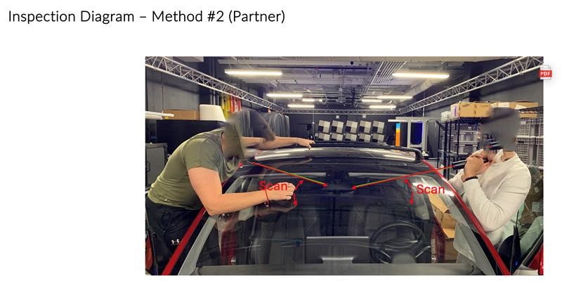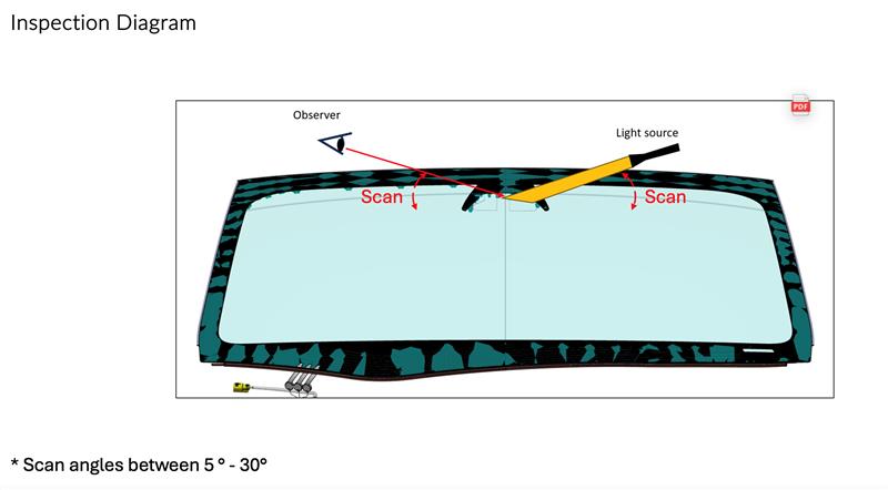 注请在室内进行检查。注手电筒应照在面向您的那一面挡风玻璃上;请参阅图片查看正确的检查方法。注如果按照检查方法使用手电筒检查后无法确认是否存在模糊点和污迹,请继续执行步骤 3,使用摄像头预览法进行确认。注如果按照检查方法使用手电筒检查后可以确认存在模糊点和污迹,请转至步骤 4。