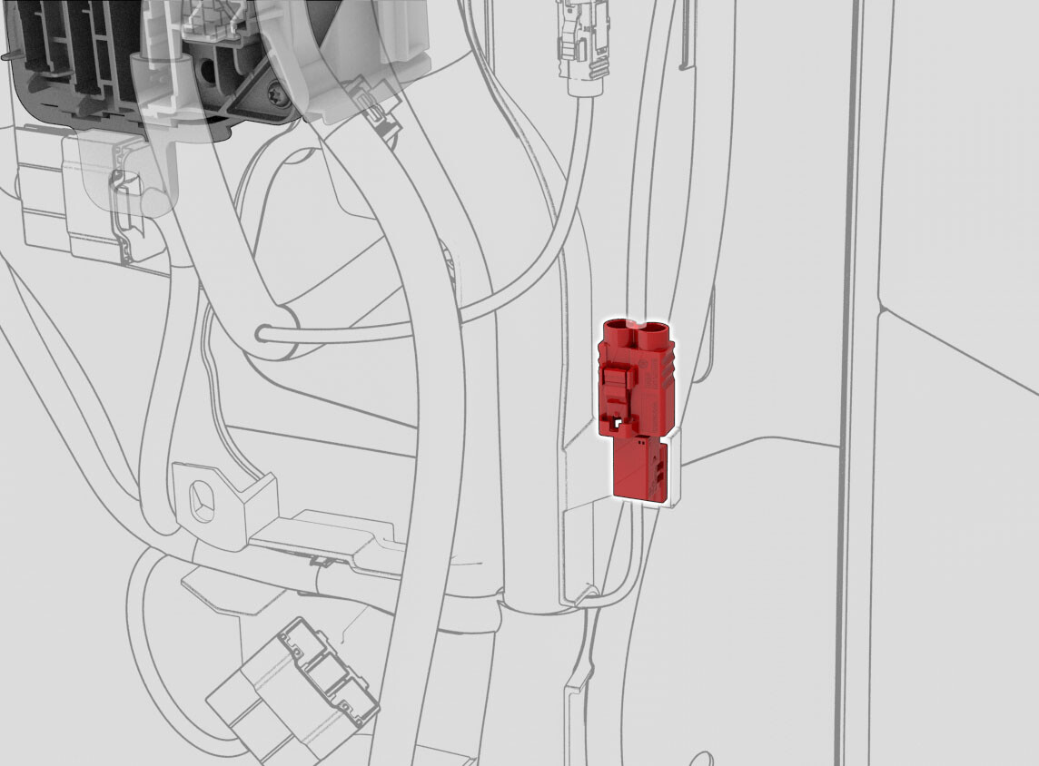 - 松开连接器锁,然后将 J1 电源电气连接器从右侧车身控制器模块上断开。