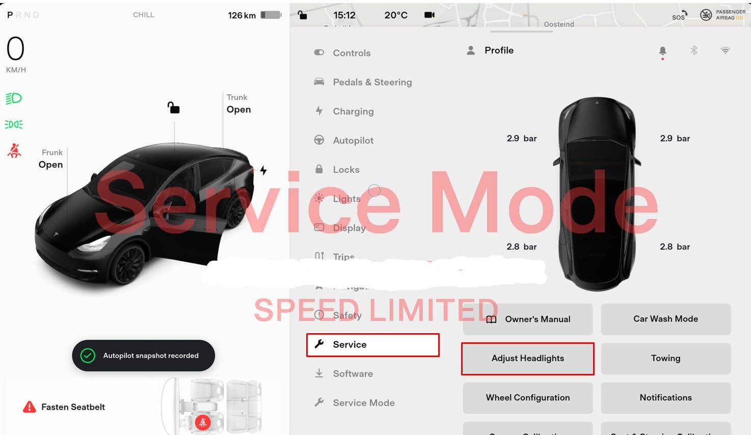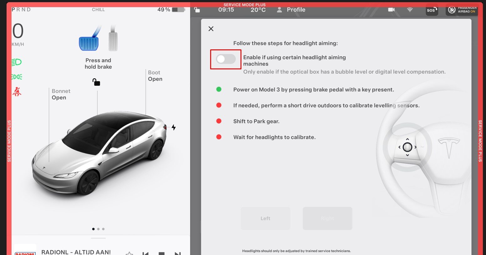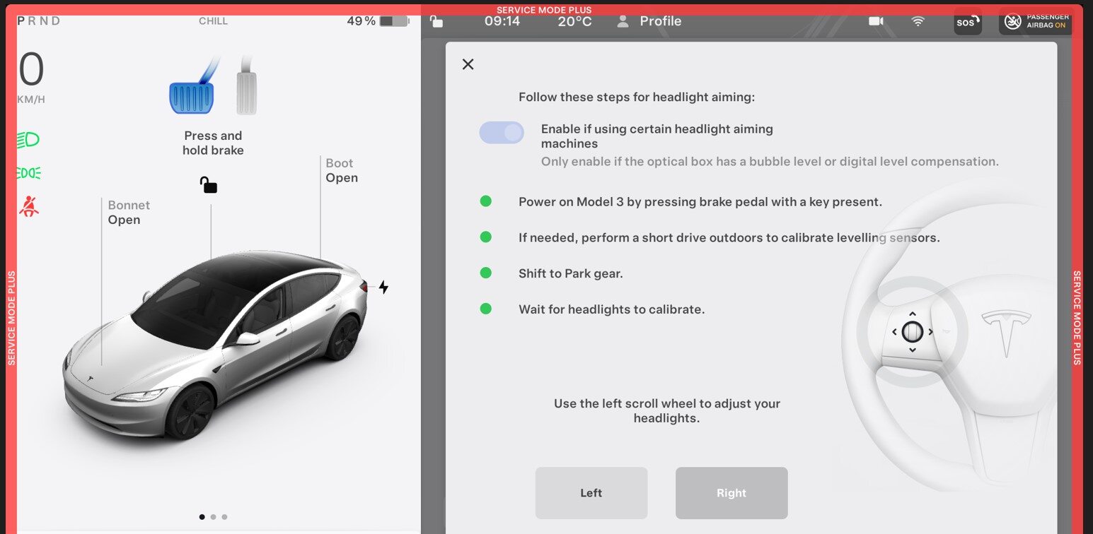 - 在触摸屏上,点击,以启用“前照灯维护模式”。